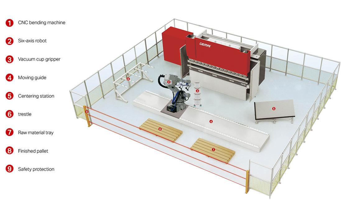 The CNC sheet bending flexible processing unit organicall combines the CNC bending machine and the robot through the effectively reducing the labor intensity of manual operation, and significantly improving the production efficiency and greatly saving costs. According to the bending process of the workpiece,the bending unit scheme can be customized to meet the needs of customers to the maximum extent.